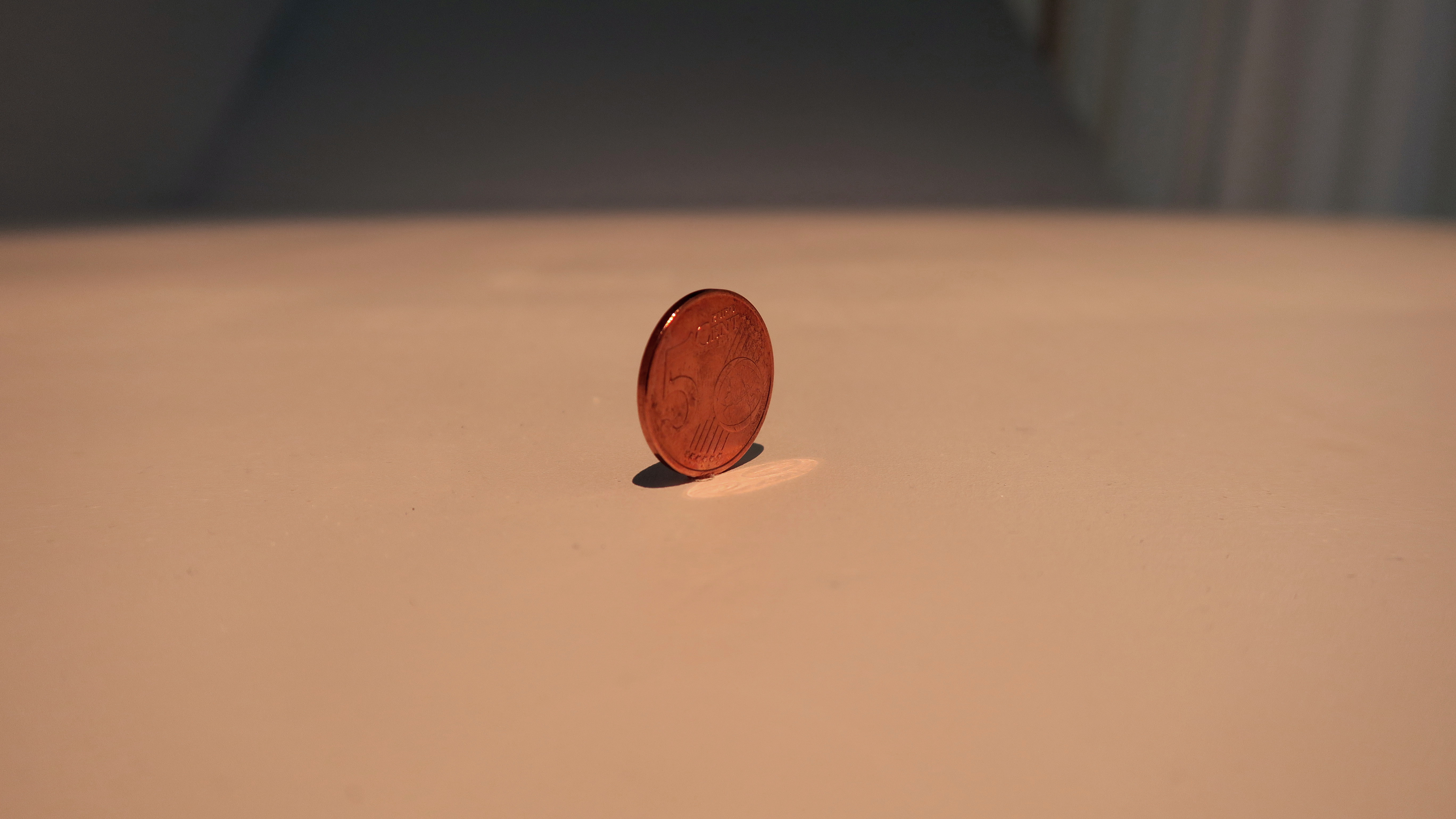 Pièce de monaie, projecteur LED, ombre, réflexion lumineuse, dimensions variables.