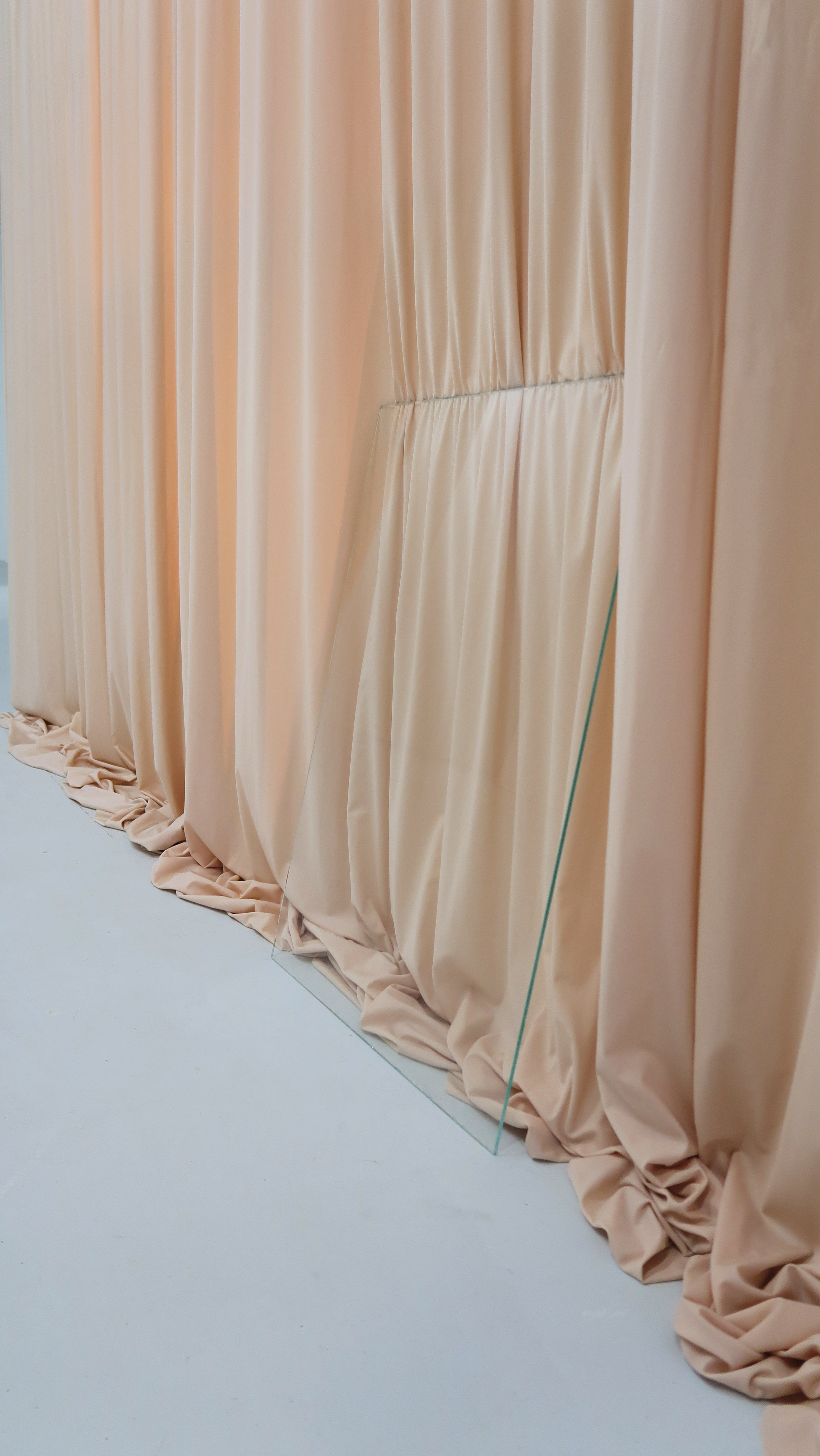 Rideaux (tissu), plaques de verre, dimensions variables.