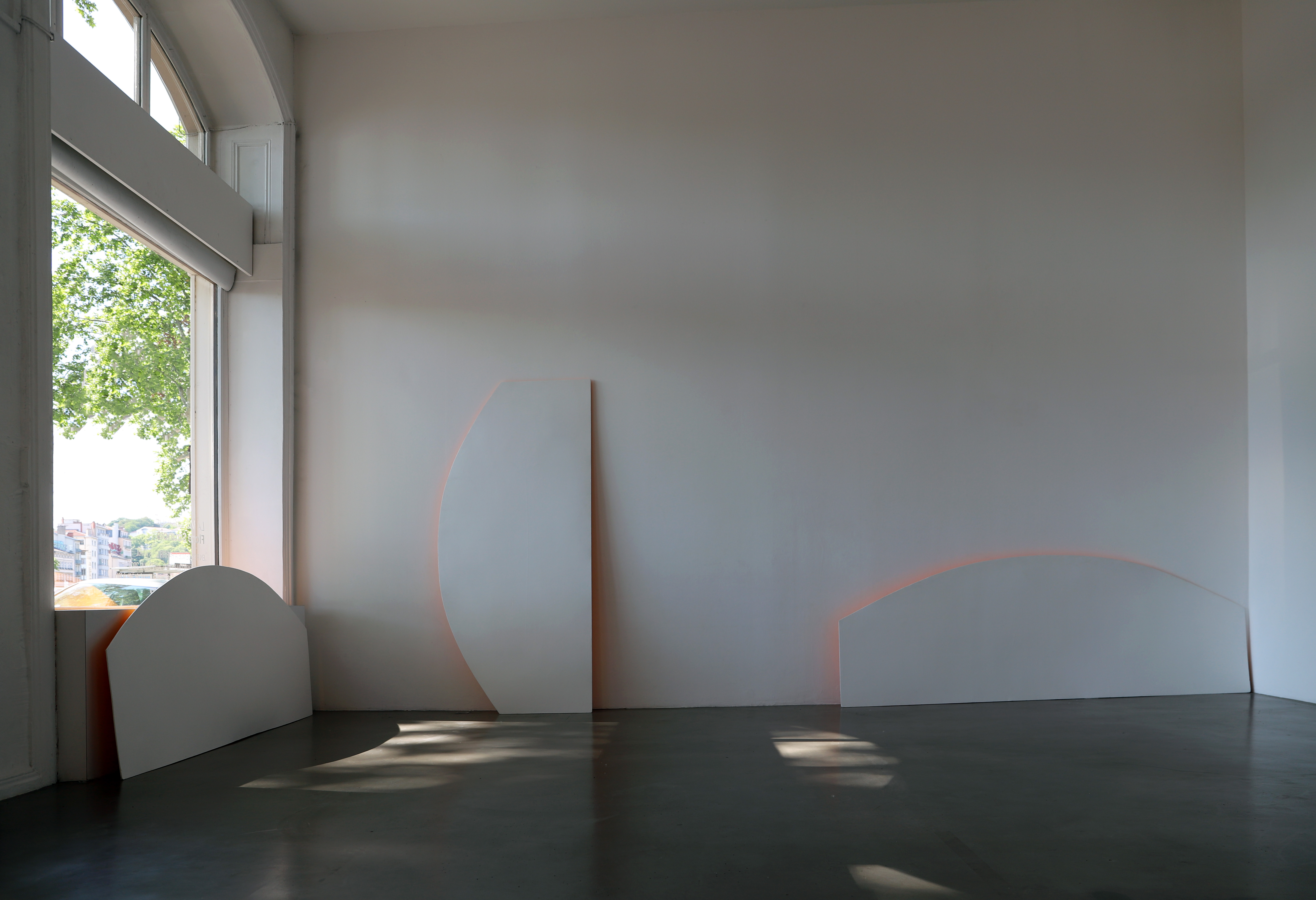 “Pour Jours, Flore Saunois a sorti des réserves de la BF15 les panneaux de bois qui servent à occulter les vitres en demi-lune de l'espace d'exposition lorsque celui a besoin d'être transformé en boite noire. Elle leur a fait subir une légère transformation, en recouvrant l'une de leur face d'un papier orange. Puis elle les a exposés dans l'espace, comme des sculptures, posées contre un mur, la face colorée tournée vers ce dernier. La couleur vibrait et irradiait légèrement les contours et alentours. Circule dans cette pièce et dans sa perception la question de l'usage d'une forme, celle de la trace et du souvenir, celle du déplacement qui engendre la beauté. Par une série de gestes simples et minimaux – trouvaille, prélèvement, déplacement, recouvrement, irradiation de la couleur-, l'artiste active une pièce à forte aura poétique.”