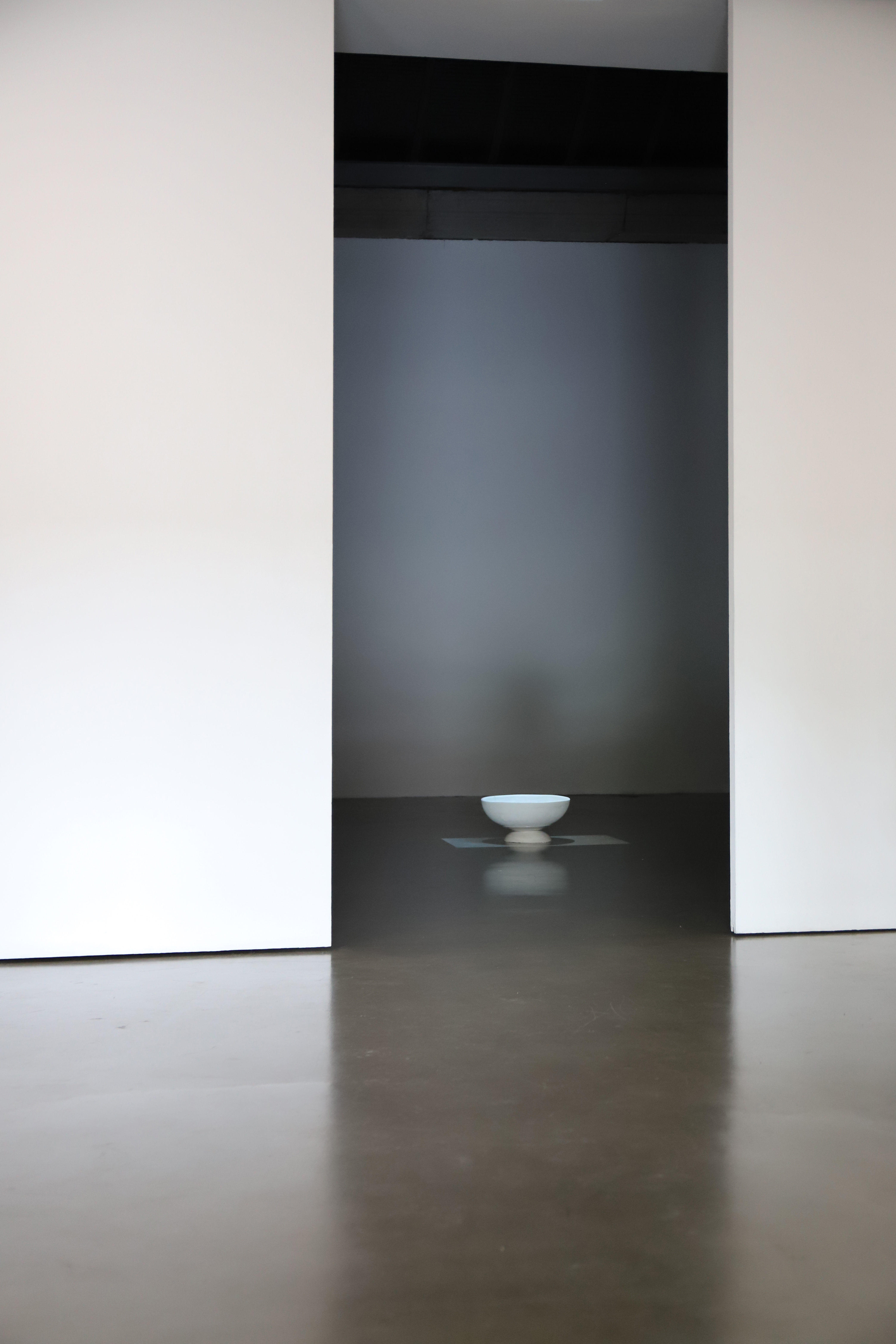 This installation attempts to reconcile physical and temporal paradoxes: a bowl made of soap is filled with immaterial water, a projection flowing infinitely into the recipient.